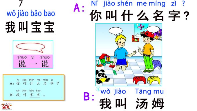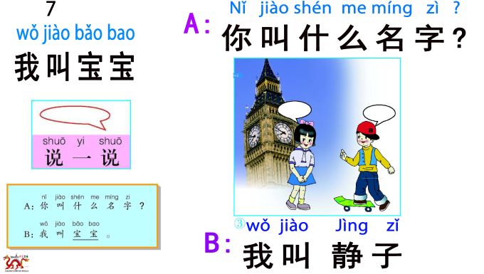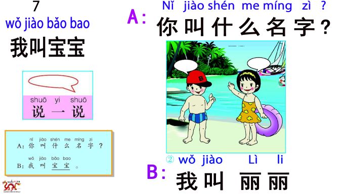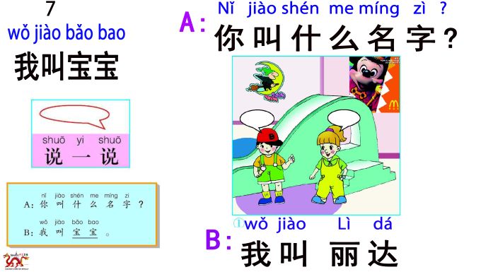 16) B: 我叫宝宝/Wǒ jiào bǎo bǎo/ Mi nombre es BaoBao
