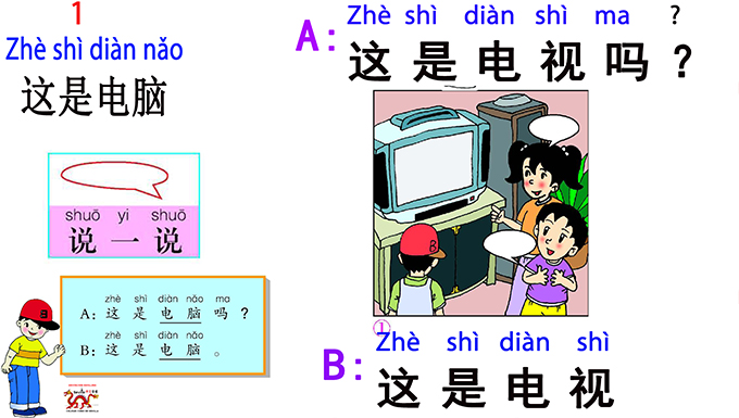 20) B: 这是电视. /B: Zhè shì diàn shì/B: Esto es un televisor./This is a televisión.